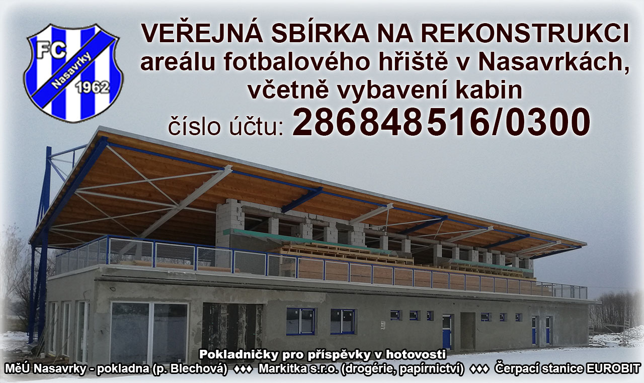 jistě jste si všimli, že finišují práce na projektu rekonstrukce areálu fotbalového hřiště. Fotbalový klub FC Nasavrky vyhlašuje dobročinnou sbírku na dofinancování akce rekonstrukce areálu fotbalového hřiště včetně vybavení kabin.
