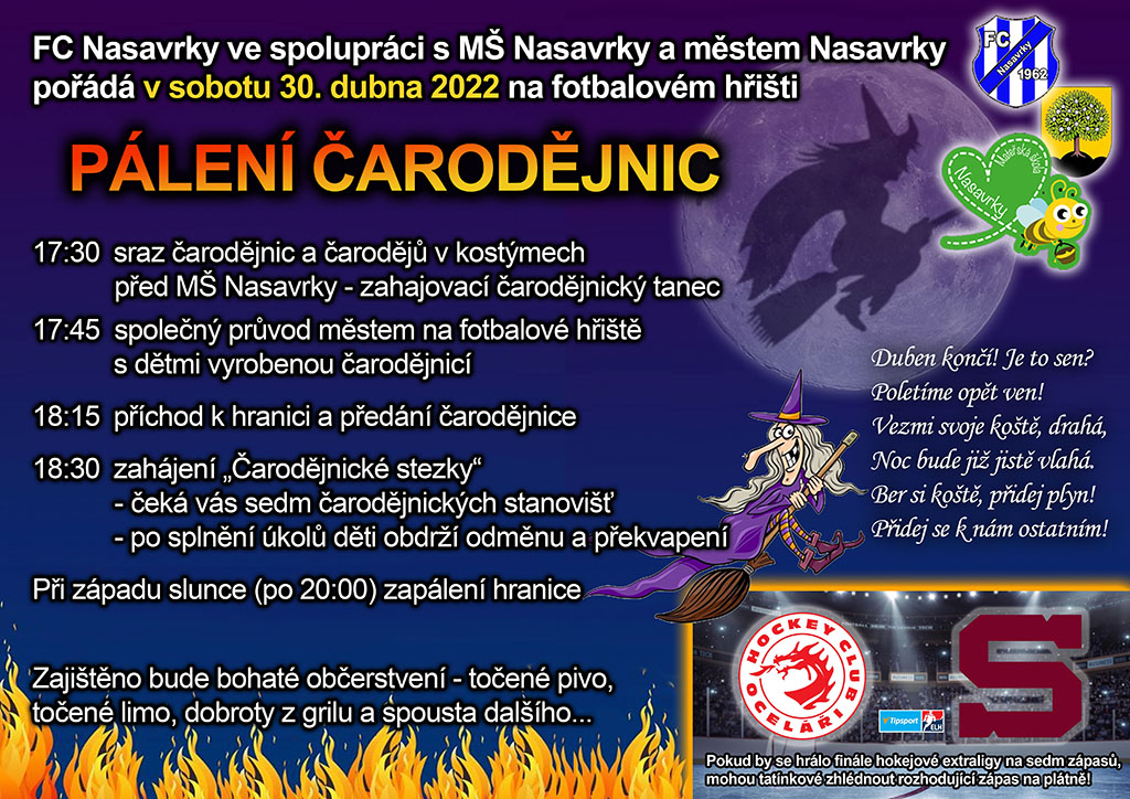 FC Nasavrky Vás srdečně zve na tradiční pálení čarodějnic, které se koná v sobotu 30. dubna 2022.